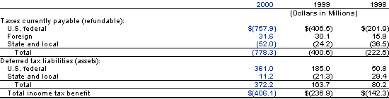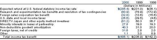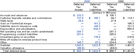 No income tax provision has been made for the portion of undistributed earnings of foreign subsidiaries deemed permanently reinvested that amounted to approximately $56.8 million and $29.7 million at December 31, 2000 and 1999, respectively. Repatriation of all accumulated earnings would have resulted in tax liabilities of $19.9 million in 2000 and $10.4 million in 1999. At December 31, 2000, Hughes has $98.9 million of deferred tax assets relating to foreign operating loss carryforwards expiring in varying amounts between 2001 and 2005. A valuation allowance was provided for all foreign operating loss carryforwards. At December 31, 2000, Hughes has $24.2 million of foreign tax credits which will expire in 2006. At December 31, 2000, a Hughes subsidiary has $46.0 million of alternative minimum tax credits generated in separate filing years, which can be carried forward indefinitely. At December 31, 2000, Hughes subsidiaries have $75.6 million of deferred tax assets relating to federal net operating loss carryforwards which will expire in varying amounts between 2009 and 2018. Hughes has an agreement with Raytheon Company (Raytheon) which governs Hughes rights and obligations with respect to U.S. federal and state income taxes for all periods prior to the spin-off and merger of Hughes defense electronics business with Raytheon in 1997. Hughes is responsible for any income taxes pertaining to those periods prior to the merger, including any additional income taxes resulting from U.S. federal and state tax audits, and is entitled to any U.S. federal and state income tax refunds relating to those years. Hughes also has an agreement with Boeing which governs Hughes rights and obligations with respect to U.S. federal and state income taxes for all periods prior to the sale of Hughes Satellite Businesses. Hughes is responsible for any income taxes pertaining to those periods prior to the sale, including any additional income taxes resulting from U.S. federal and state tax audits, and is entitled to any U.S. federal and state income tax refunds relating to those years. The U.S. federal income tax returns of Hughes have been examined through 1994. All years prior to 1986 are closed. Issues relating to the years 1986 through 1994 are being contested through various stages of administrative appeal. The Internal Revenue Service (IRS) is currently examining Hughes U.S. federal tax returns for years 1995 through 1997. Management believes that adequate provision has been made for any adjustment which might be assessed for open years. Hughes reached an agreement with the IRS regarding a claim for refund of U.S. federal income taxes related to the treatment of research and experimentation costs for the years 1983 through 1995. Hughes recorded a total of $172.9 million of research and experimentation tax benefits during 1998, a substantial portion of which related to the above noted agreement with the IRS and covered prior years. Taxes receivable from GM at December 31, 2000 and 1999, respectively, were approximately $175.0 million and $610.6 million of which $100.0 million and $290.8 million, respectively, are included in prepaid expenses and other in the consolidated balance sheets. Note 10: Retirement Programs and Other Postretirement Benefits Substantially all of Hughes employees participate in Hughes contributory and non-contributory defined benefit retirement plans. Benefits are based on years of service and compensation earned during a specified period of time before retirement. Additionally, an unfunded, nonqualified pension plan covers certain employees. Hughes also maintains a program for eligible retirees to participate in health care and life insurance benefits generally until they reach age 65. Qualified employees who elected to participate in the Hughes contributory defined benefit pension plans may become eligible for these health care and life insurance benefits if they retire from Hughes between the ages of 55 and 65. The components of the pension benefit obligation and the other postretirement benefit obligation, as well as the net benefit obligation recognized in the consolidated balance sheets, are shown below: