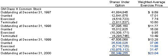 Note 12: Incentive Plans Under the Hughes Electronics Corporation Incentive Plan (the Plan), as approved by the GM Board of Directors in 1999, shares, rights or options to acquire up to 233 million shares of GM Class H common stock on a cumulative basis were authorized for grant, of which 107 million shares were available at December 31, 2000 subject to GM Executive Compensation Committee approval. The GM Executive Compensation Committee may grant options and other rights to acquire shares of GM Class H common stock under the provisions of the Plan. The option price is equal to 100% of the fair market value of GM Class H common stock on the date the options are granted. These nonqualified options generally vest over two to five years, expire ten years from date of grant and are subject to earlier termination under certain conditions. Changes in the status of outstanding options were as follows: