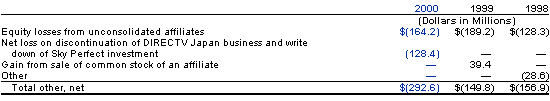 Equity losses from unconsolidated affiliates at December 31, 2000 are primarily comprised of losses at DIRECTV Japan, Hughes Ispat Limited, of which Hughes owns 45%, and Galaxy Entertainment de Venezuela, C.A., of which Hughes owns 20%. Note 14: Related-Party Transactions In the ordinary course of its operations, Hughes provides telecommunications services and sells electronic components to, and purchases sub-components from, related parties. The following table summarizes significant related-party transactions: