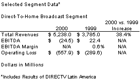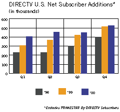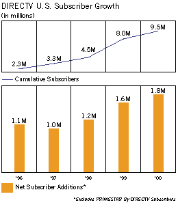 DIRECTV is the worlds leading provider of digital satellite television entertainment. As of year-end 2000, DIRECTV served more than 9.5 million customers, making it the third-largest multi-channel entertainment provider in the United States. With its industry-leading monthly average revenue per user (ARPU) of $59 at year-end 2000, DIRECTV generated more than $4.7 billion in revenues in 2000a 38-percent increase over 1999and $151 million in EBITDA.