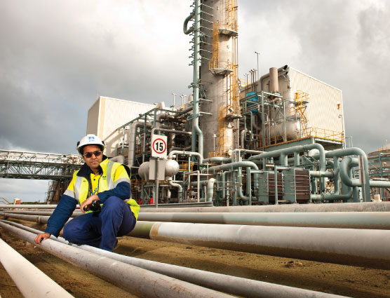 Left: CSBP Process Engineer Moiz Alibhai in front of the nitric acid plant in which CSBP is currently trialling nitrous oxide abatement technology.