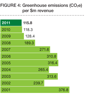 The diversity of our business operations provides some difficulty in developing Group-wide metrics to enable review of our emissions performance over time, other than the data provided in figure 3. Figure 4 shows our reported emissions per million dollars of revenue from the year 2001, which explains our capacity to improve emission intensity over time (in these 10 years there have been significant changes in the Group's business activities).