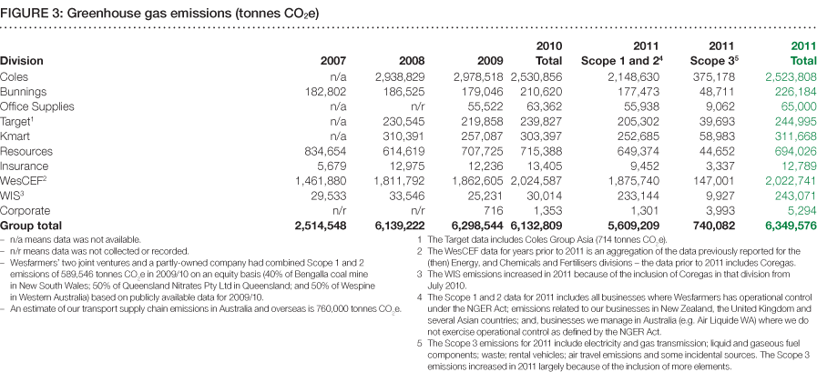 At the time of this report's preparation, Wesfarmers recorded 5,044,231 tonnes carbon dioxide equivalents (CO2e) (Scope 1 and 2 emissions) in our NGER Act report for 2010/11. This Sustainability Report declares a total of Scope 1, 2 and 3 emissions of 6,349,576 tonnes CO2e (a difference of 1,305,345 tonnes CO2e).