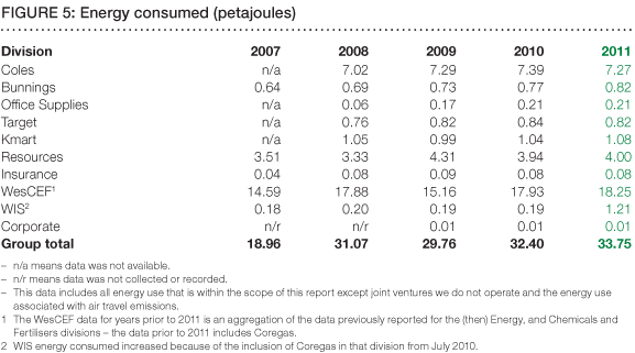 The Group energy usage in our 2010/11 NGER Act report will be different to the data in figure 5 below. The difference relates to legal and definitional issues required by the NGER Act, and largely relates to: natural gas passed through our Kleenheat LPG operations at Kwinana, Western Australia, which is not actually converted to product or combusted, but which has to be counted in the NGER Act report (12.84 petajoules); and the enGen remote area power stations which are not under our operational control for NGER Act purposes and therefore are reported by our mining company customers (3.57 petajoules).
