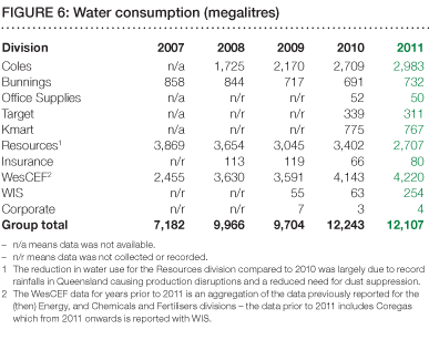 Estimated water use (scheme, surface and ground water) across the Group totalled 12,107 megalitres (figure 6). Last year's estimated total Group consumption was 12,243 megalitres. The reported decrease is largely due to reduced water use at our Curragh mine in Queensland, mainly as a result of the Queensland floods.