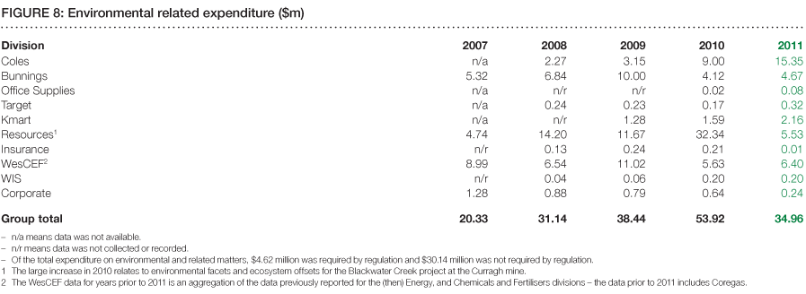 Total environmental expenditure, including land remediation costs for 2010/11, is $34.96 million (figure 8). This compares with last year's total of $53.92 million, the difference largely due to the completion of the Blackwater Creek diversion project at the Curragh mine site. These costs include salaries and overheads, specific environmental projects and any other costs (such as fees paid to consultants and capital expenses) for an environment-related purpose, which can include emission reduction, effluent management, revegetation and energy efficiency.