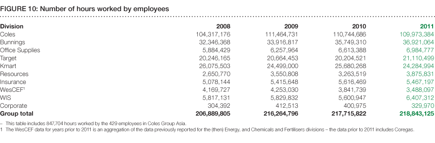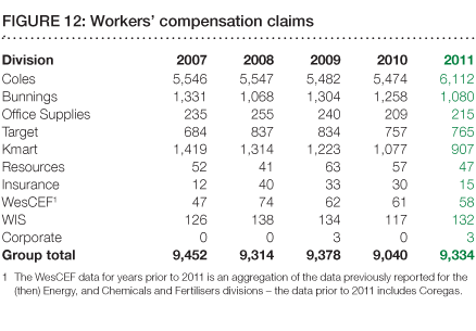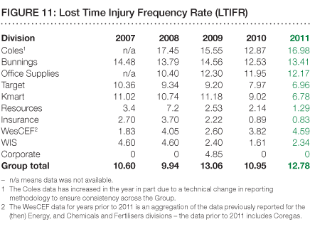 For the reporting period, the Group LTIFR was 12.78, up from 10.95 for the previous year. Most of this reported increase was due to a change in LTIFR calculation in Coles to standardise the reporting definitions across the Group, although Bunnings and WesCEF reported increases in LTIFR as well. The TRIFR at year end was 40.94, compared to 49.3 in July 2010, although some of this decrease is attributable to standardising our reporting of TRIs across the Group.