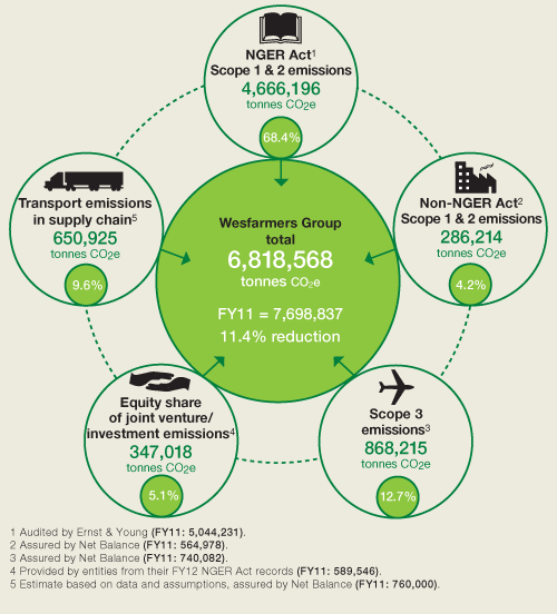 In our NGER Act report for 2011/12, Wesfarmers recorded 4,666,196 tonnes carbon dioxide equivalent (CO2e) (Scope 1 and 2 emissions). This is a decrease of 7.49 per cent compared to the 5,044,231 tonnes CO2e reported in the 2010/11 NGER Act report.