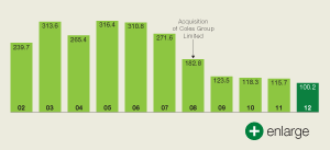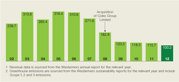 By measuring reported emissions per million dollars of revenue at the Group level (see figure 5) it is possible to track the changes in our emission intensity over time against the indicator of business performance. Over the past 10 years there have been significant changes in the Group’s business activities, including the acquisition of the Coles Group (in 2007), significant increases in production at our industrial businesses and extensive growth in our retail businesses. These relative metrics are also reported in each business unit section of this report.