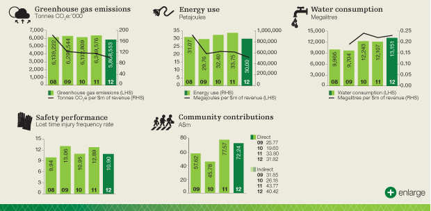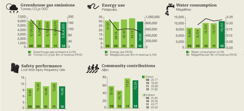 We have also included some broad metrics to describe both the Group and business unit progress over time in the areas of greenhouse emissions, energy and water use, occupational safety information, as well as community contributions.