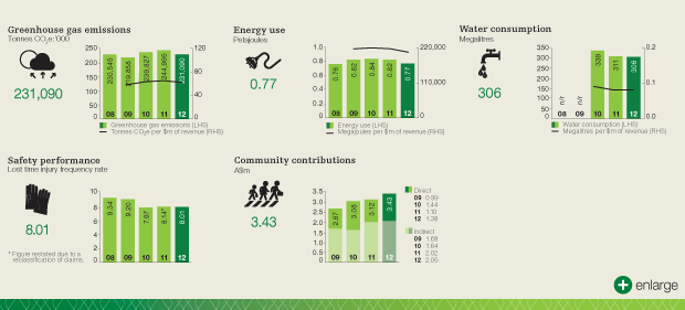 Our total greenhouse gas emissions were 231,090 tonnes of CO2e, down six per cent on last year. Our greenhouse gas emissions were largely due to electricity consumption from lighting and air-conditioning in our stores. Total energy consumption was 773,097 gigajoules, down six per cent on last year. This energy use included 88 per cent electricity and seven per cent transport fuel.