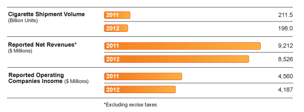 - Excluding the impact of currency, OCI increased by 0.2%, reflecting higher pricing and favorable asset impairment and exit costs compared to 2011, offset by an unfavorable volume/mix of $380 million, higher manufacturing costs, and higher marketing costs, principally reflecting marketing investment behind new brand launches and the roll-out of the “Be Marlboro” marketing campaign.