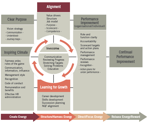 As part of the Kambuku process, an organisational performance model was developed. Known as ‘the vital elements of a performing organisation’, this model sets the benchmark for the internal standards, systems and processes that facilitate employee engagement and participation. |