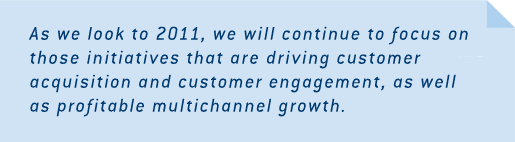Based on our strong competitive and financial position, we are excited about our prospects going forward. As we look to 2011, we will continue to focus on those initiatives that are driving customer acquisition and customer engagement, as well as profitable multichannel growth.