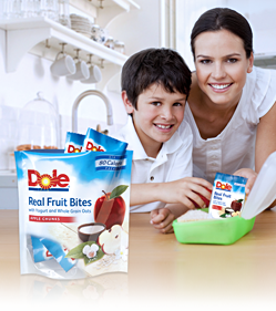 At 80 calories snacking just got healthier with the new Dole Real Fruit Bites. Each bite-size piece is made from real dried fruit chunks, coated with yogurt, and sprinkled with toasted whole grain oats. Conveniently packaged in 6 single-serve pouches. Snack on them any time, anywhere!