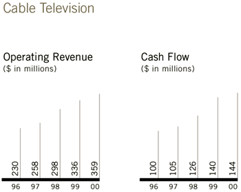Cable division operating cash flow was $143.7 million in 2000, up only 2 percent from $140.2 million in 1999. Revenue increased to $358.9 million, up 7 percent from $336.3 million in 1999. Basic cable programming expense continued its steady rise to $66.3 million, up 12 percent in 2000. The other major reason for sluggish growth was the second and third quarter launch of free Cable ONE Digital® to half of Cable ONE’s customer base. Access to 149 new additional digital channels is being offered free for the first 12 months to any basic cable customer who agrees to self-install a digital receiver. The free 12-month offer has a dampening impact on 2000 and 2001 cash flows.