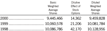 plan. No options have been exercised Average Number of Shares Outstanding. Basic earnings per share are based on the weighted average number of shares of common stock outstanding during each year. Diluted earnings per common share are based upon the weighted average number of shares of common stock outstanding each year, adjusted for the dilutive effect of shares issuable under outstanding stock options. Basic and diluted weighted average share information for 2000, 1999, and 1998 is as follows: