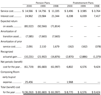 The total (income) cost arising from the Companys defined benefit pension and postretirement plans for the years ended December 31, 2000, January 2, 2000, and January 3, 1999, consists of the following components (in thousands):