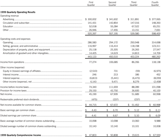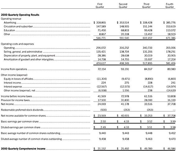 are amortized over the lesser Investments in Affiliates. The Company uses the equity method of accounting for its investments in and earnings or losses of affiliates for which it does not control but does exert significant influence. Cost Method Investments. The Company uses the cost method of accounting for its minority investments in non-public companies where it does not have significant influence over the operations and management of the investee. Investments are recorded at the lower of cost or fair value as estimated by management. Goodwill and Other Intangibles. Goodwill and other intangibles represent the unamortized excess of the cost of acquiring subsidiary companies over the fair values of such companies net tangible assets at the dates of acquisition. Goodwill and other intangibles are being amortized by use of the straight-line method over periods ranging from 15 to 40 years (with the majority being amortized over 15 to 25 years). Long-lived Assets. The recoverability of long-lived assets, including goodwill and other intangibles, is assessed whenever adverse events and changes in circumstances indicate that previously anticipated undiscounted cash flows warrant assessment. Program Rights. The broadcast subsidiaries are parties to agreements that entitle them to show syndicated and other programs on television. The cost of such program rights is recorded when the programs are available for broadcasting, and such costs are charged to operations as the programming is aired. Revenue Recognition. Revenue from media advertising is recognized, net of agency commissions, when the underlying advertisement is published or broadcast. Revenues from newspaper and magazine subscriptions are recognized upon delivery. Revenues from newspaper and magazine retail sales are recognized upon delivery with adequate provision made for anticipated sales returns. Cable subscriber revenue is recognized monthly as earned. Education revenue is recognized ratably over the period during which educational services are delivered. The Company bases its estimates for sales returns on historical experience and has not experienced significant fluctuations between estimated and actual return activity. Amounts received from customers in advance of revenue recognition are deferred as liabilities. Deferred revenue to be earned after one year is included in Other Liabilities in the Consolidated Balance Sheets. Postretirement Benefits Other Than Pensions. The Company provides certain healthcare and life insurance benefits for retired employees. The expected cost of providing these postretirement benefits is accrued over the years that employees render services. Income Taxes. The provision for income taxes is determined using the asset and liability approach. Under this approach, deferred income taxes represent the expected future tax consequences of temporary differences between the carrying amounts and tax bases of assets and liabilities. Foreign Currency Translation. Gains and losses on foreign currency transactions and the translation of the accounts of the Companys foreign operations where the U.S. dollar is the functional currency are recognized currently in the Consolidated Statements of Income. Gains and losses on translation of the accounts of the Companys foreign operations, where the local currency is the functional currency, and the Companys equity investments in its foreign affiliates are accumulated and reported as a separate component of equity and comprehensive income. Stock-based Compensation. The Company accounts for stock-based compensation using the intrinsic value method prescribed by Accounting Principles Board Opinion No. 25, Accounting for Stock Issued to Employees. Pro forma disclosures of net income and earnings per share as if the fair-value based method prescribed by Statement of Financial Accounting Standards (SFAS) No. 123, Accounting for Stock-Based Compensation had been applied in measuring compensation expense are provided in Note G. Sale of Subsidiary/Affiliate Securities. The Companys policy is to record investment basis gains arising from the sale of equity interests in subsidiaries and affiliates that are in the early stages of building their operations as additional paid-in capital, net of taxes. New Accounting Pronouncements. In December 1999, the Securities and Exchange Commission (SEC) issued Staff Accounting Bulletin No. 101, Revenue Recognition in Financial Statements (SAB 101). This bulletin summarized certain of the SECs views regarding the application of generally accepted accounting principles to revenue recognition in financial statements. SAB 101 did not have a material impact on the Companys financial statements. In June 1998, the Financial Accounting Standards Board (FASB) issued Statement of Financial Accounting Standards No. 133, Accounting for Derivative Instruments and Hedging Activities, effective for fiscal year 2001. This statement establishes accounting and reporting standards for derivative instruments and hedging activities and requires companies to recognize derivative instruments as either an asset or liability on the balance sheet at fair value. This statement did not have a material impact on the Companys financial statements as the Company does not engage in significant derivative or hedging activities. I
