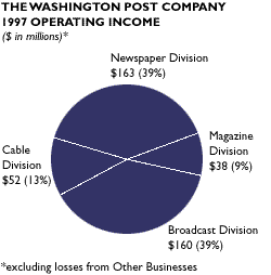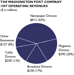 Newspaper Division The Washington Post -- a morning daily and Sunday newspaper published in Washington, D.C. For the 12-month period ending September 30, 1997, The Post's unaudited estimated average circulation was 793,000 daily and 1,108,000 Sunday. The Post maintains 20 foreign, 5 national, and 13 metropolitan news bureaus. The Washington Post National Weekly Edition -- a tabloid publication of selected Post articles on politics and government, edited for a national audience, with a circulation of approximately 92,000. The Washington Post Writers Group -- - a syndicator of 28 writers and cartoonists and material from Newsweek to newspapers and magazines throughout the world. The Herald -- a morning daily and Sunday newspaper published in Everett, Washington, 30 miles north of Seattle. The Herald's unaudited estimated average circulation for the 12-month period ending September 30, 1997, was 54,692 daily and 64,159 Sunday. Gazette Newspapers, Inc. -- a publisher of 25 community weekly newspapers in Montgomery, Frederick, Carroll, and Prince George's Counties, Maryland, with a combined controlled circulation of 390,000; one paid-circulation weekend newspaper with a circulation of 13,000 and a monthly business publication with a circulation of 30,000 in Montgomery County; a monthly technology publication with a circulation of 30,000 that covers technology in Maryland and is distributed throughout the Baltimore-Washington region; 11 military publications with a controlled circulation of 157,000; and operator of one of the largest commercial printing sites in the Washington area. Robinson Terminal Warehouse -- a newsprint handling and storage facility with operations in Alexandria and Springfield, Virginia. Capitol Fiber Inc. -- a handler and seller to recycling industries of old newspaper and other waste paper collected in the Washington/Baltimore area.