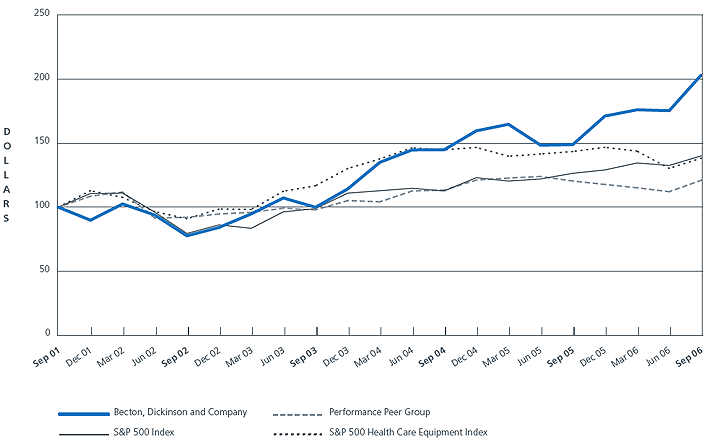 30, 2006 for BD, the S&P 500 Index, and the S&P 500 Health