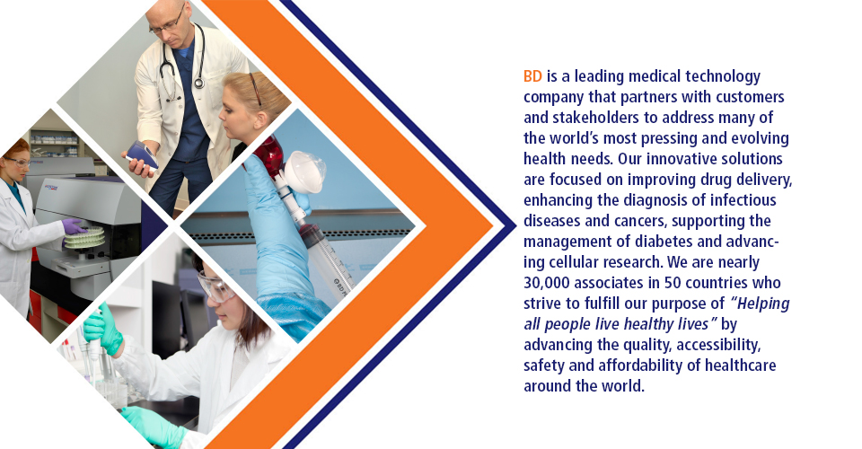 BD’s products and solutions can help address today’s most pressing healthcare issues. We are improving medication management, assurance and safety in various areas across the continuum of care. Our diagnostic solutions provide early, accurate results that enable timely and better treatment decisions and improve laboratory productivity. We are empowering researchers to advance their efforts to find cures for ailments and diseases. For each of our healthcare industry segments, we focus on providing flexible solutions that will increase clinician efficiency.