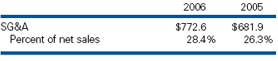 The increase in SG&A was primarily due to increased incentive compensation on higher earnings, as well as stock-based compensation and higher advertising costs. Stock-based compensation of $22.0 million, which accounted for a 0.8 percentage point increase as a percentage of net sales, was recorded in 2006 as a result of the adoption of Statement of Financial Accounting Standards (SFAS) 123(R) effective December 1, 2005 (see note 9 of the financial statements). Advertising expense increased by $12.7 million, adding another 0.5 percentage point increase to SG&A as a percentage of net sales, as we spent at a higher level to support our consumer brands.