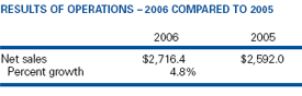 Key initiatives that drove sales in 2006 included higher volume driven by acquisitions, new products and effective marketing programs, as well as pricing actions taken early in the year. Sales from Simply Asia Foods, acquired in the third quarter of 2006, contributed 0.7% to the sales increase. Foreign exchange rates had an unfavorable effect on sales in the first half of 2006 and a favorable effect on reported sales in the second half of the year. On a full year basis, the sales effect of foreign exchange rates was slightly favorable.