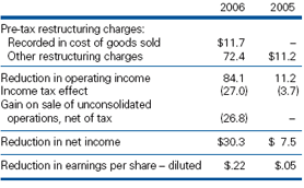 Pre-tax restructuring charges for both 2006 and 2005 related to actions under our restructuring plans to consolidate our global manufacturing, rationalize our distribution