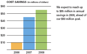 facilities. The restructuring plan is reducing complexity and increasing the organizational focus on growth opportunities in both the consumer and industrial businesses. We are projecting up to $55 million ($37 million after-tax) of annual cost savings by the end of 2008. In 2006, we realized $10 million ($7 million after-tax) of savings and another $35 million ($24 million after-tax) in 2007. This has improved margins and increased earnings per share, offset higher costs, as well as allowed us to invest a portion of these savings in sales growth drivers such as brand advertising. These savings are reflected in both cost of goods sold and selling, general and administrative expenses in the income statement. Total pre-tax charges under this restructuring plan are estimated to be $115 to $125 million with approximately 65% related to the consumer segment and 35% related to the industrial segment. Of these charges, we expect that $85 to $90 million will consist of severance and other |