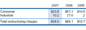 by net gains on the disposition of assets. In 2005, we recorded $10.7 million of charges as a result of actions taken under the restructuring plan. These charges included certain severance costs associated with the closing of our consumer manufacturing plant in Salinas, California, closing costs for a small plant in Belgium and costs associated with the reorganization of the sales and distribution networks in the U.S. and Europe. In our income statement, restructuring charges under this program are displayed in three line items. The gain related to our disposition of Signature and a joint venture in Japan as described under joint venture transactions is on the line entitled “(Loss) gain on sale of unconsolidated operations.” Other restructuring costs are included in restructuring charges and cost of goods sold. The business segment components of the restructuring charges recorded in 2007, 2006 and 2005 are as follows: ![]() The restructuring charges recorded in the consumer business include severance costs and special early retirement benefits associated with our voluntary separation program in several functions in the U.S. and Europe; consolidation of certain manufacturing facilities in Europe; and closures of manufacturing facilities in Salinas, California, Sydney, Australia, and Kerava, Finland. |