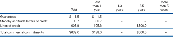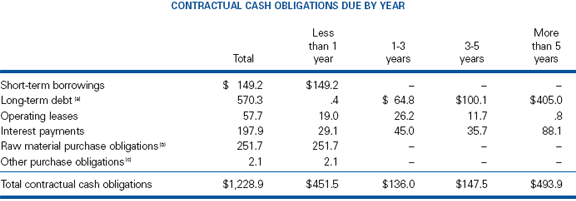 | (a) Includes $150 million of debt due in less than 1 year in the “More than 5 years” category based on our ability and intent to refinance this amount for this term. (b) Raw material purchase obligations outstanding as of year-end may not be indicative of outstanding obligations throughout the year due to our response to varying raw material cycles. (c) Other purchase obligations primarily consist of advertising media commitments. In 2008, our pension and postretirement funding is expected to be approximately $22 million. Pension and postretirement funding can vary significantly each year due to changes in legislation and our significant assumptions. As a result, we have not presented pension and postretirement funding in the table above. |