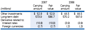 applicable period. In 2001, we incurred a $14.7 million loss on the settlement of swaps used to hedge the 2001 issuance of $294 million of medium-term notes. The loss on these swaps was deferred in other comprehensive income and is being amortized over the five to seven year life of the medium-term notes as a component of interest expense. Amounts reclassified from other comprehensive income to interest expense for settled interest rate swaps were $1.1 million, $1.6 million and $2.5 million in the years 2007, 2006 and 2005, respectively, and are included in the net change in unrealized gain or loss on derivative financial instruments in the statement of shareholders’ equity. Fair Value of Financial Instruments The carrying amount and fair value of financial instruments at November 30, 2007 and 2006 were as follows: ![]() Because of their short-term nature, the amounts reported in the balance sheet for cash and cash equivalents, receivables, short-term borrowings and trade accounts payable approximate fair value. The fair values of other investments are based on quoted market prices from various stock and bond exchanges. The long-term debt fair values are based on quotes for like instruments with similar credit ratings and terms. The interest rate and foreign currency derivatives are based on quoted market prices from various banks for similar instruments. Investments in affiliates are not readily marketable, and it is not practicable to estimate their fair value. Other investments are comprised of fixed income and equity securities held on behalf of employees in certain employee benefit plans and are stated at fair value on the balance sheet. The cost of these investments was $46.9 million and $41.0 million at November 30, 2007 and 2006, respectively. |