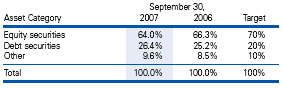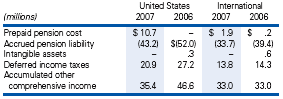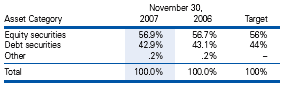 underfunded to an overfunded status. Amounts recorded in the balance sheet consist of the following: ![]() Included in the United States in the preceding table is a benefit obligation of $43.2 million and $42.9 million for 2007 and 2006, respectively, related to a nonqualified defined benefit plan pursuant to which we will pay supplemental pension benefits to certain key employees upon retirement based upon employees’ years of service and compensation. The accrued liability related to this plan was $43.1 million and $40.4 million as of November 30, 2007 and 2006, respectively. The assets related to this plan are held in a Rabbi Trust and accordingly have not been included in the preceding table. These assets were $38.1 million and $31.6 million as of November 30, 2007 and 2006, respectively. The accumulated benefit obligation is the present value of pension benefits (whether vested or unvested) attributed to employee service rendered before the measurement date and based on employee service and compensation prior to that date. The accumulated benefit obligation differs from the projected benefit obligation in that it includes no assumption about future compensation levels. The accumulated benefit obligation for the U.S. pension plans was $347.2 million and $361.8 million as of September 30, 2007 and 2006, respectively. The accumulated benefit obligation for the international pension plans was $198.0 million and $188.1 million as of November 30, 2007 and 2006, respectively. Our actual and target weighted-average asset allocations of U.S. pension plan assets as of September 30, 2007 and 2006, by asset category, were as follows: ![]() |