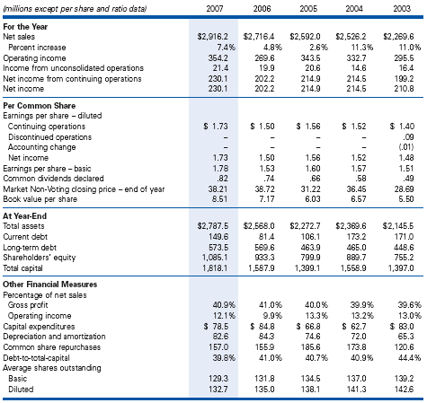 In 2006, McCormick began to record stock-based compensation expense as explained in note 9 of the financial statements. Prior year results have not been adjusted. Stock-based compensation reduced operating income by $21.2 million, net income by $14.7 million and earnings per share by $0.11 in 2007. Stock-based compensation reduced operating income by $22.0 million, net income by $15.1 million and earnings per share by $0.11 in 2006.