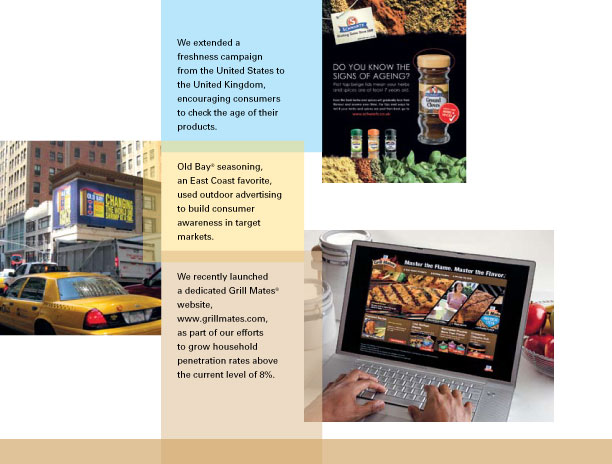 | We are driving growth through strong global brands, innovative new products and acquisitions. Our portfolio of brands enjoys strong consumer loyalty around the world, and we work diligently to earn that loyalty every day by focusing on solving our consumers' culinary needs in practical and flavorful ways. To build upon the power of our brands, we expanded our proven marketing efforts - including print ads and sampling programs - by 13% in 2008. |