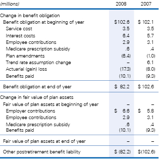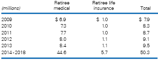 We currently provide postretirement medical and life insurance benefits to certain U.S. employees who were covered under the active employees’ plan and retire after age 55 with at least 5 years of service. Employees hired after December 31, 2008 will not be eligible for a company subsidy. They will be eligible for coverage on an access only basis. The subsidy provided under these plans is based primarily on age at date of retirement. These benefits are not pre-funded but paid as incurred.
