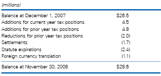 The following table summarizes the activity related to our gross unrecognized tax benefits from December 1, 2007 to November 30, 2008: