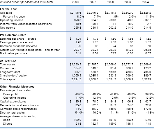 Historical Financial Summary ![]() The historical financial summary includes the impact of certain items that affect the comparability of financial results year to year. From 2005 to 2008, restructuring charges were recorded and are included in the table below. In 2008 the restructuring charges totaled $16.6 million. Also, in 2008 an impairment charge of $29.0 million was recorded to reduce the value of the Silvo brand. Related to the acquisition of Lawry’s in 2008, we recorded a gain. In 2004, the net gain from a special credit was recorded. The net impact of these items is reflected in the following table: ![]() In 2006, we began to record stock-based compensation expense as explained in note 11 of the financial statements. Prior years’ results have not been adjusted. Stock-based compensation reduced operating income by $17.9 million, net income by $12.4 million and earnings per share by $0.10 in 2008. Stock-based compensation reduced operating income by $21.2 million, net income by $14.7 million and earnings per share by $0.11 in 2007. Stock-based compensation reduced operating income by $22.0 million, net income by $15.1 million and earnings per share by $0.11 in 2006. Total capital includes debt and shareholders’ equity. An eleven-year financial summary is available at ir.mccormick.com, as well as a report on EVA (Economic Value Added) and return on invested capital.