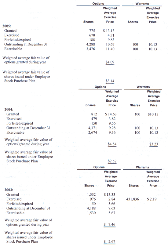 Changes in stock options and warrants for the years ended December 31, 2005, 2004 and 2003 were as follows (shares in thousands):
