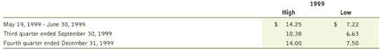 The following table sets forth the high and low closing prices as reported by the NASDAQ National Market.
