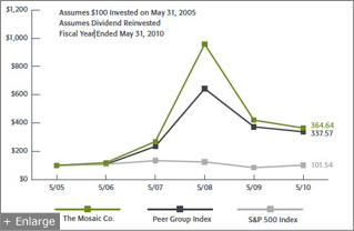 ![]() ANNUAL MEETING OF STOCKHOLDERSMosaic shareholders are invited to attend our 2010 Annual Meeting of Stockholders which will be held on Thursday, October 7, 2010, at 10 a.m. EDT. The meeting will be at The Palmetto Club at Fishhawk Ranch, 17004 Dorman Road, Lithia, Florida 33547.SAFE HARBORCertain statements in the Annual Report that are neither reported financial results nor other historical information are forward-looking statements. Such forward-looking statements are not guarantees of future performance and are subject to risks and uncertainties that could cause actual results and Mosaic's plans and objectives to differ materially from those expressed in the forward-looking statements.SHAREHOLDER RETURN INFORMATIONThe following performance graph compares the cumulative total return on our common stock for a period beginning May 31, 2005, with the cumulative total return of the Standard & Poor's 500 Stock Index, and a peer group of companies selected by us.STOCK PERFORMANCEComparison of Cumulative Total Return Among The Mosaic Company, S&P 500 Index and Peer Group Index.CORPORATE HEADQUARTERS3033 Campus DriveSuite E490 Plymouth, MN 55441 763.577.2700 800.918.8270 TRANSFER AGENTAmerican Stock Transfer & Trust Company59 Maiden Lane New York, NY 10038 877.777.0800 INDEPENDENT REGISTERED PUBLIC ACCOUNTING FIRMKPMG LLP 90South Seventh Street Minneapolis, MN 55402 MEDIA CONTACTRob LittManager — Public Affairs 763.577.6187 media@mosaicco.com INVESTOR CONTACTChristine BattistDirector — Investor Relations 763.577.2828 investor@mosaicco.com Mosaic's 10-K Report, filed in July 2010 with the Securities and Exchange Commission, is available to shareholders and interested parties without charge by contacting Christine Battist. WEBSITEwww.mosaicco.com |