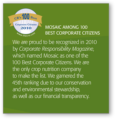 ![]() As the global population continues to grow, there is little doubt that food security will rank among the world's highest priorities. Today at Mosaic, it already does.At Mosaic, we recognize that our business can only thrive long term if we act responsibly. The continuous effort of integrating environmental, social and economic goals through global awareness, careful planning and operational efficiency is what we call Social Responsibility. We are constantly configuring and adapting our activities so that we can help the world grow the food it needs, while ensuring the environment remains healthy and productive both now and into the future.The global population is expected to grow by another one billion by 2030. As the global population continues to grow, there is little doubt that food security will rank among the world's highest priorities. Today at Mosaic, it already does. Around the world, Mosaic helps farmers boost yields through efficient and responsible use of crop nutrients. Scientists estimate that crop nutrients account for 40 to 60 percent of global crop yields. When farmers optimize their use of crop nutrients, they produce more food on less land, using less water. This helps conserve scarce natural resources, preserves wildlife habitats and protects biodiversity.(a) GLOBAL AGRICULTURE INITIATIVESImproving agriculture in developing countries is a cornerstone of any long-term global food security paradigm. Through our Village Projects in Guatemala and India, investments in Haiti and our work with the Millennium Villages in Africa, our efforts are helping to end the cycle of extreme poverty, hunger and disease.One of the initiatives that is yielding positive results is our partnership with Millennium Promise, working with seven countries in sub-Saharan Africa. In fiscal 2010, we impacted the lives of 277,000 villagers by donating more than 2,600 tonnes of crop nutrients and transporting them to the Millennium Village clusters. To date, maize yields have nearly tripled on average, supporting a 30 percent reduction in levels of chronic malnutrition among children under two. The increased yields are not only helping the farmers feed themselves; as surplus crops are sold, they create capital that the villagers can invest to alleviate other areas of need. In developed countries, Mosaic works to improve farmers' environmental efficiency. We provide farmers with environmentally focused software and online programs that enhance their nutrient applications. These tools provide farmers a competitive advantage by helping them apply crop nutrients with fewer passes over the field, reducing the amount of fuel used. Ensuring that each field receives the optimal amount of crop nutrients prevents over-application, reducing waste and the potential for crop nutrient runoff. Innovative technologies and management practices are critical tools in meeting the challenges of food security. Mosaic conducts research on over 300 sites globally through a network of university and contract researchers. 2010 was our third year of partnership with HarvestPlus, a global alliance of institutions and scientists seeking to improve human nutrition through new varieties of staple food crops that have higher levels of micro-nutrients. The research is focusing on addressing iron, zinc and vitamin A deficiencies among the global poor — three of the 10 leading causes of illness and disease in developing countries. SUSTAINING OUR ENVIRONMENTSince 2005, Mosaic has reduced direct energy consumption in our U.S. phosphate operations by 23 percent, reducing greenhouse gas emissions and increasing investor returns at the same time.In Florida, for example, nearly 50 percent of the electrical load in our phosphate operations runs on power we generate ourselves, by capturing excess heat from our production process. That's enough energy saved to power 100,000 homes daily. We are committed to reducing our carbon emissions through a variety of sustainable practices, including cogeneration of electricity from waste heat and the use of hydro sources of electricity. In 2009, we averted 940,000 metric tonnes of carbon dioxide equivalent, reducing our total Scope 2 carbon emissions by 62 percent over conventional sources of electricity. We understand the importance of water to a healthy planet, and we are proud of our water conservation efforts. We recycle 95 percent of the water used in our North American Phosphates operations and 82 percent of the water required for our Potash business. In Florida, we created and now fully fund the Horse Creek Stewardship program to ensure mining activities do not adversely affect this important water source. Government officials continuously monitor the water quality against rigorous standards, and Mosaic issues reports each year to key stakeholders. Habitat protection is always a top priority. We have placed a conservation easement on 16,588 acres in Central Florida, ensuring the long-term protection of precious lands and waters. We reclaimed and released 4,527 acres of land in calendar 2009. Sustainability is also a priority for our company's infrastructure. Mosaic at Circa FishHawk, our new Florida headquarters, home to about 400 employees, has earned us a Leadership in Energy and Environmental Design (LEED) Gold certification due to its design and construction, which includes the latest in green technology. Our commitment to social responsibility requires us to use our resources wisely to produce positive outcomes for our communities and our investors while preserving and protecting the environment. We believe this is the only path to long-term sustainable success. By honoring the triple bottom line, we will help the world grow the food it needs more efficiently and with a minimal impact on the environment. |