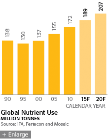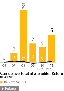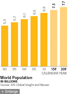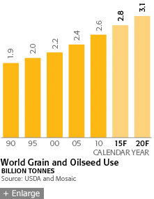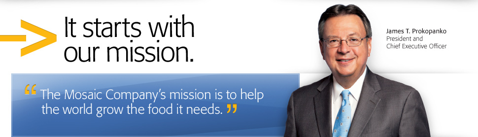 the visibility and appreciation for Mosaic's mission has increased dramatically. Agriculture is entering a new green revolution, emerging as one of the global economy's most critical business sectors, and for good reason. The world's farmers and the organizations that support them face the challenge of securing the world's food supply, producing enough food to satisfy the needs of a global population that is steadily growing in size — and prosperity — year