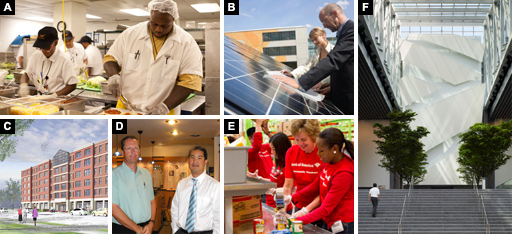 F. Reducing our emissions. After reducing our greenhouse gas emissions by 18 percent between 2004 and 2009 — twice our original target — we've established a new global 15 percent reduction target for 2015. We are reducing our energy use and pursuing LEED® (Leadership in Energy and Environmental Design) certification in 20 percent of our corporate real estate, like 1 Bank of America Center in Charlotte, N.C.