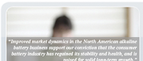 During the year, we benefited from improved market dynamics in the North American alkaline battery business. After several years of challenging competitive conditions, we saw renewed pricing stability, a reduction in promotional activity, and a resumption of marketplace momentum, which helped to fuel a 12 percent increase in net sales for Rayovacs North American battery business. These encouraging developments support our conviction that the consumer battery industry in North America has regained its stability and health, and is poised for solid long-term growth.