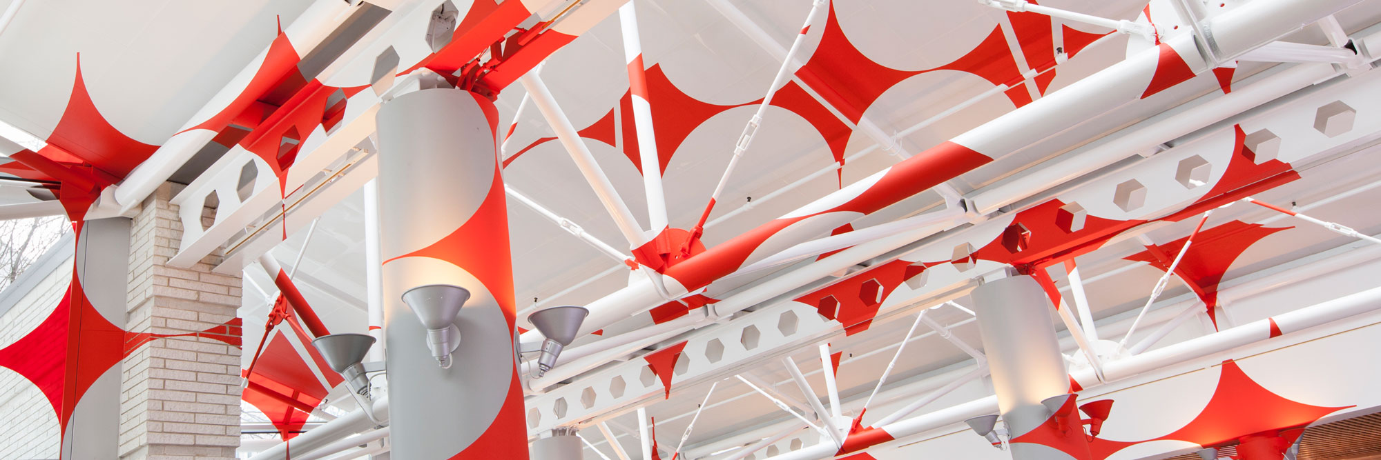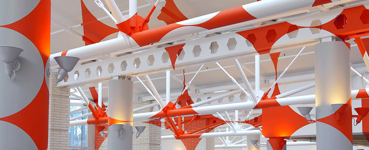 In December 2013, Progressive welcomed the Swiss artist Felice Varini to its corporate headquarters. Stepping into the precise point of view from which Varini conceived the painting, a beautiful pattern of hollowed discs magically appears. The pattern appears to the viewer’s eyes like a transparent overlay of color, as if it’s hanging in the air above a highly trafficked cafeteria area. This engagement between the viewer, the space, and the painting is central to Varini’s work. More ›