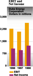 Operating income for 1998 was $2,433 million compared to $1,970 million in 1997 and $2,159 million in 1996. Earnings before interest and taxes (EBIT) were $2,647 million, $2,108 million and $2,294 million for 1998, 1997 and 1996, respectively. Operating income and earnings before interest and taxes, excluding the effect of gains on asset sales of $34 million by Field Services in 1998, are affected by the same fluctuations for Duke Energy and each of its business segments. Earnings before interest and taxes by business segment are summarized below and are discussed by business segment thereafter.