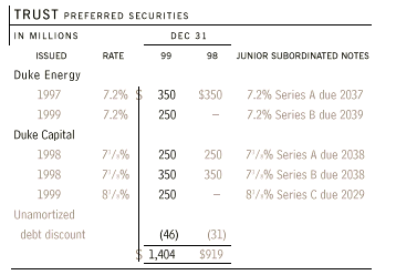 Duke Energy and Duke Capital Corporation (Duke Capital) have each formed business trusts for which they own all the respective common securities. The trusts issue and sell preferred securities and invest the gross proceeds in assets of the trusts. Substantially all the assets of each trust are junior subordinated notes issued by the respective company.