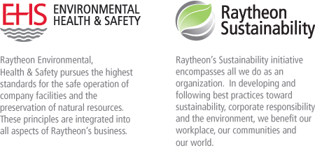 Raytheon is committed to sustainability, including protection of the environment and conservation of natural resources. We operate our facilities, and engineer our processes and products, with the goal of maximizing efficiency and reducing environmental impacts. We apply waste minimization strategies to eliminate, reuse and recycle our wastes. We work tirelessly to reduce energy consumption and greenhouse gas emissions. We strive to exceed regulatory compliance standards and to integrate energy efficiency and environmentally friendly processes into the daily practices of every Raytheon location.